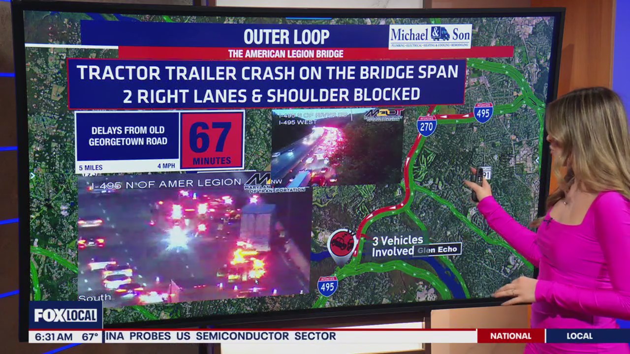 BETHESDA, Md. - A multi-vehicle crash involving a tractor-trailer is causing major delays on the outer loop of Interstate 495 early Monday morning.
