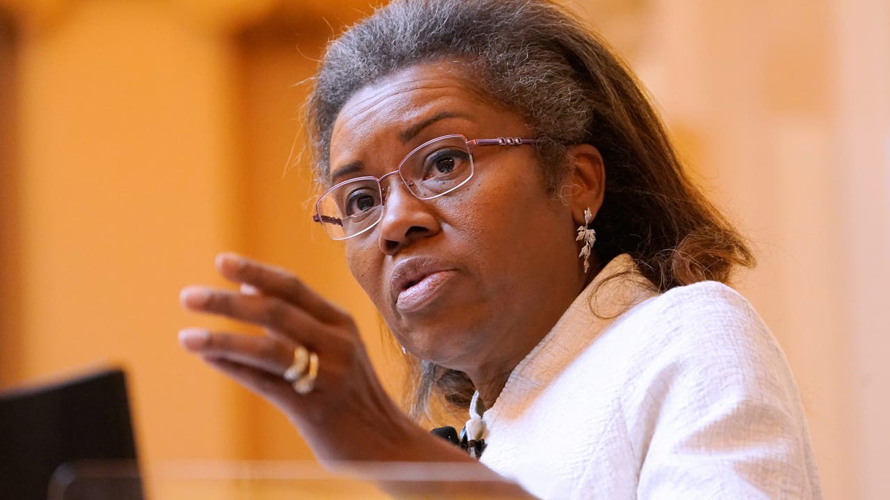 FILE - Virginia Lt. Gov. Winsome Earle-Sears gestures as she presides over the Senate during the session at the state Capitol on Feb. 8, 2022, in Richmond, Va. (AP Photo/Steve Helber, File)