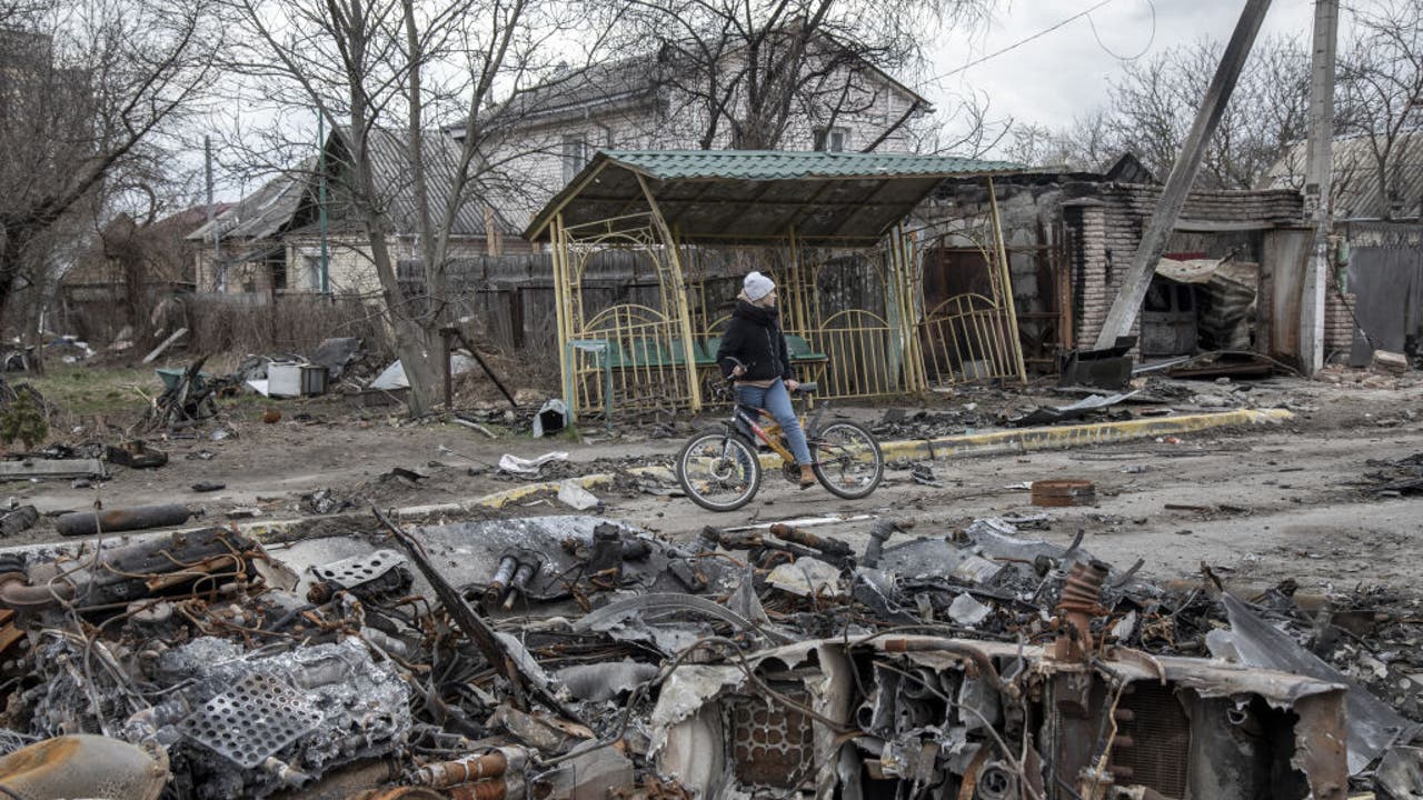 A female civilian rides amid the destruction on a street in the town of Bucha, on the outskirts of Kyiv, after the Ukrainian army secured the area following the withdrawal of the Russian army from the Kyiv region on previous days, Bucha, Ukraine, on