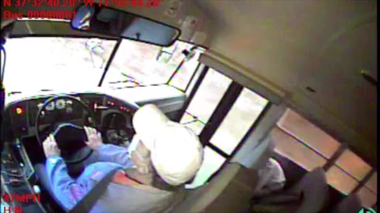 Footage from inside the bus – provided by the Powhatan County Public Schools District – shows the faun propelled through the windshield and landing in the aisle before sliding down near the entry door.