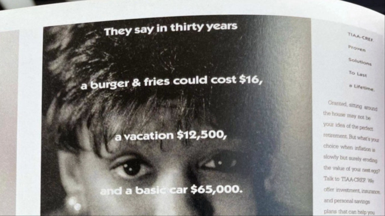 "They say in thirty years a burger & fries could cost $16, a vacation $12,500, and a basic car $65,000," the Teachers Insurance and Annuity Association of America (TIAA) and College Retirement Equities Fund (CREF) wrote in the advertisement.