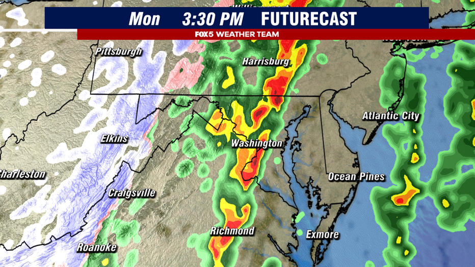 The FOX 5 Weather Team is monitoring the potential for strong to severe thunderstorms across the DC region on Monday, March 16, as a powerful storm system moves east toward the Mid-Atlantic.