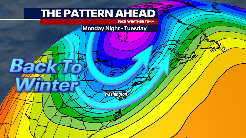 A strong trough associated with a late-season polar vortex in Canada will bring colder weather back to the D.C. region for the middle of next week.