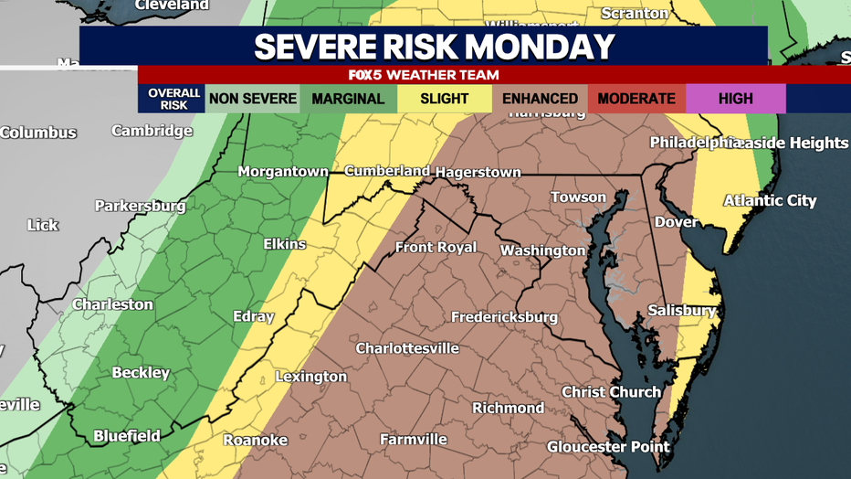 WASHINGTON - Less than a week removed from Washington, D.C.'s largest 24-hour temperature drop on record, more severe weather is expected in the DMV Monday, with threats of severe thunderstorms and even tornadoes.