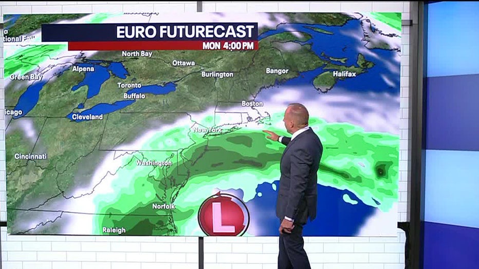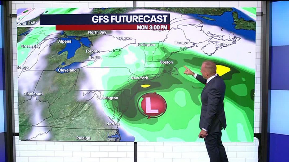 "By the time we get to Monday, look where the storm is," Gregory said. "This is pretty close, and you can see the heavy rain making it to the Jersey Shore, the strong wind coming in from the ocean, and it kind of lingers into about Tuesday. Eventually, it kind of goes back out to sea."