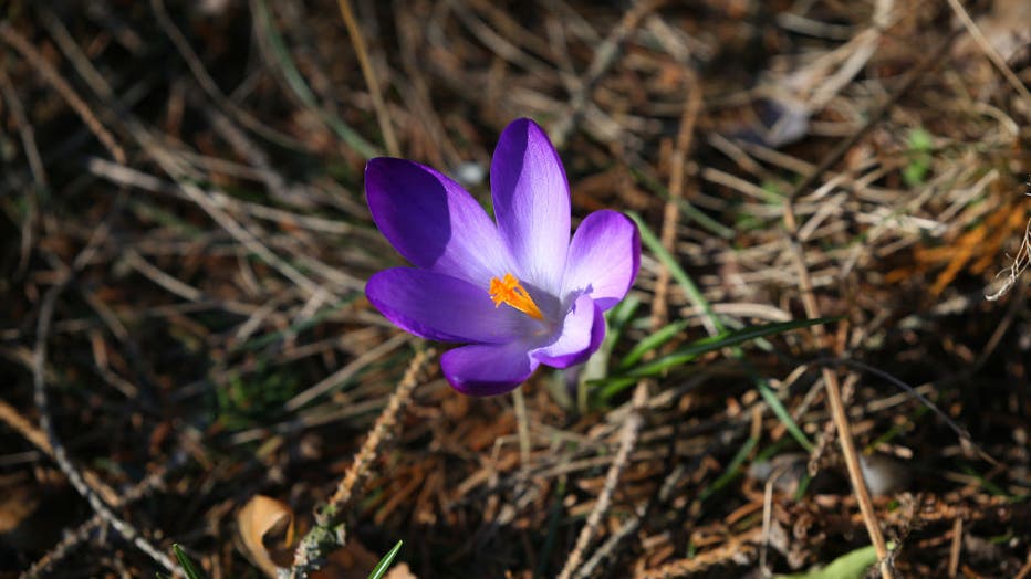 The calyx of a crocus is open and stands out against the still barren winter ground. (Photo by Wolfgang Kumm/picture alliance via Getty Images)