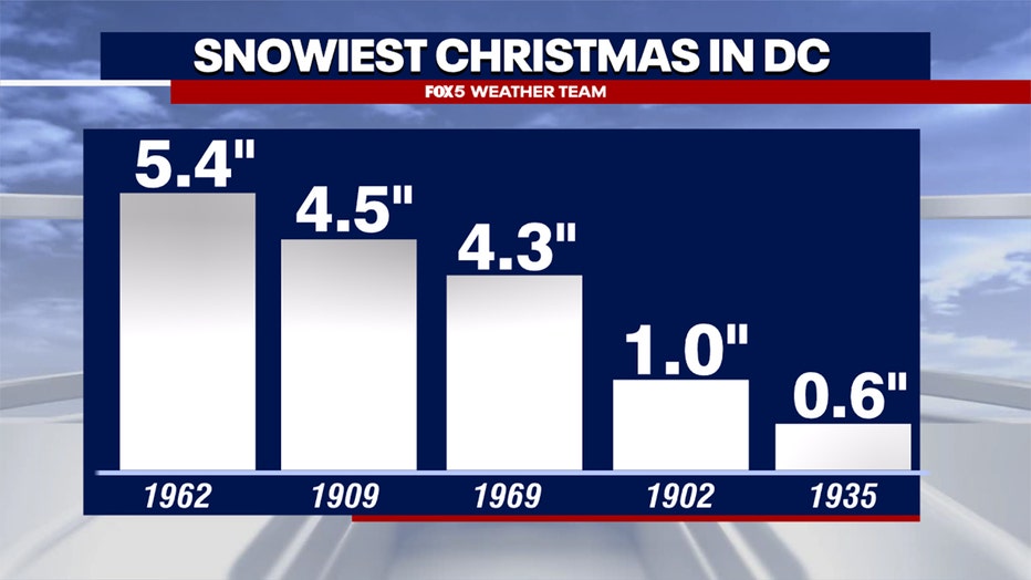 Back to 1871, DC has only seen 1" or more of snow fall four times on Christmas Day. Three times on Christmas Eve.
