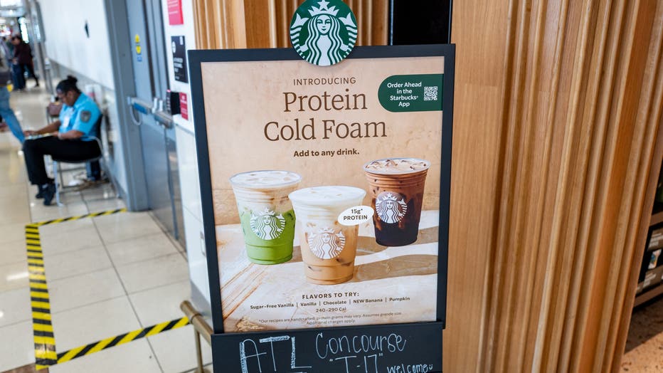 Sign for Starbucks Protein Cold Foam drinks at Hartsfield-Jackson Atlanta International Airport, Atlanta, Georgia, United States, October 19, 2025. (Photo by Smith Collection/Gado/Getty Images)