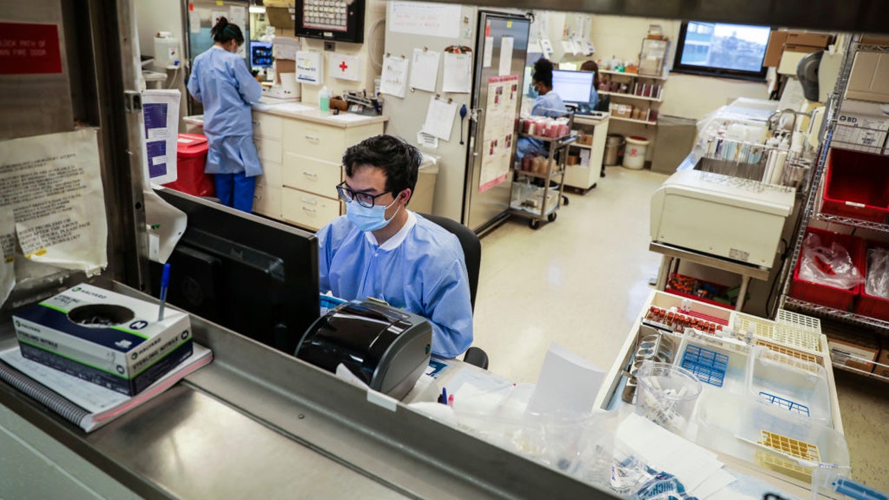 A hospital worker works at the receiving desk at a lab in Boston, Massachusetts on Nov. 12, 2020. (Erin Clark/The Boston Globe via Getty Images)