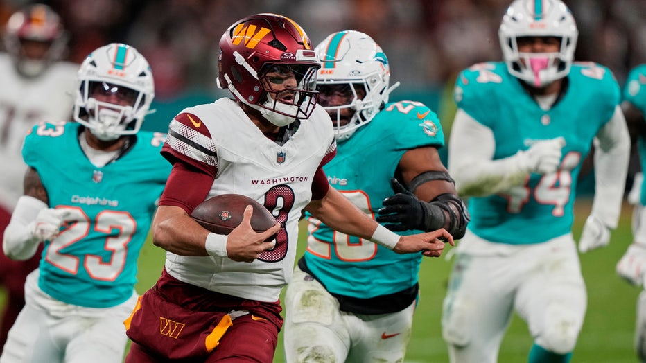Washington Commanders quarterback Marcus Mariota (8) scrambles against the Miami Dolphins, Sunday, Nov. 16, 2025 in Madrid. (Doug Benc/AP Content Services for the NFL)