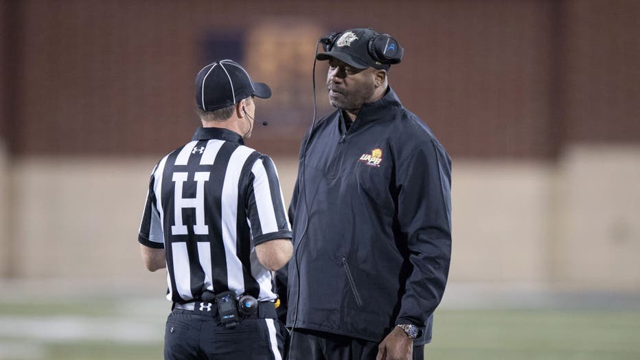Arkansas-Pine Bluff Golden Lions head coach Monte Coleman talks to an official during the fourth quarter of the college football game between the Arkansas-Pine Bluff Golden Lions and Akron Zips on September 9, 2017, at Summa Field at InfoCision Stadi