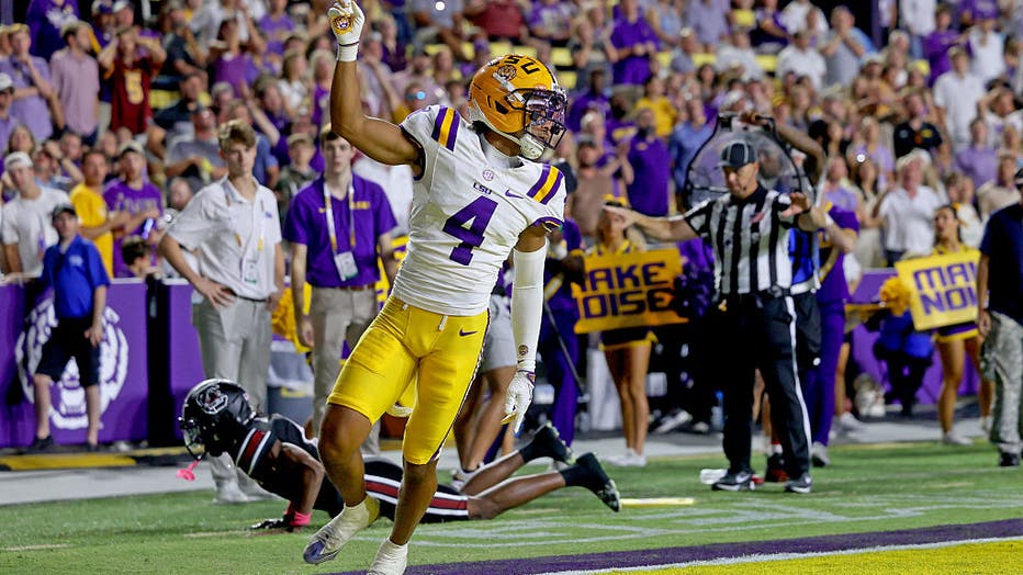 Cornerback Mansoor Delane of the Louisiana State Tigers celebrates a pass defense during the game against the South Carolina Gamecocks on October 11, 2025. (Photo by Michael DeMocker/Getty Images)