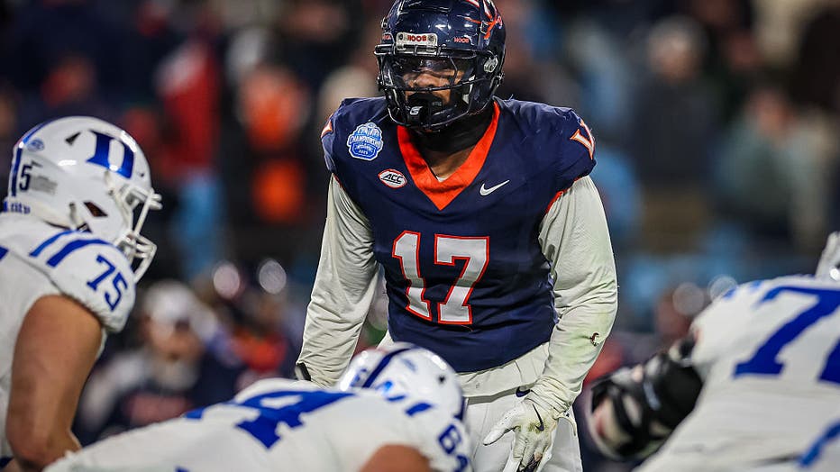 Mitchell Melton of the Virginia Cavaliers reads the offense during the 2025 ACC Football Championship against the Duke Blue Devils. (Photo by David Jensen/Getty Images)