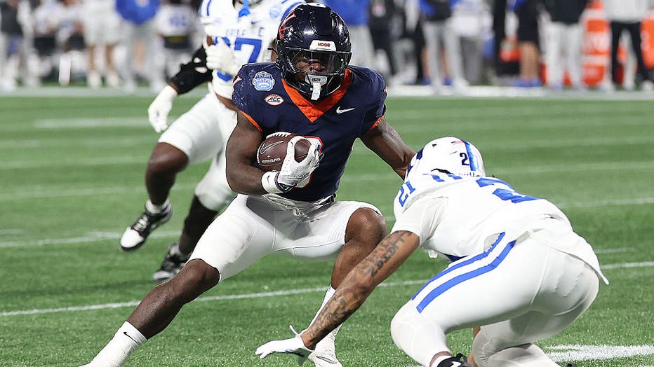 Virginia Cavaliers running back J'Mari Taylor during the ACC Championship game against the Duke Blue Devils on December 6, 2025 (Photo by John Byrum/Icon Sportswire via Getty Images)