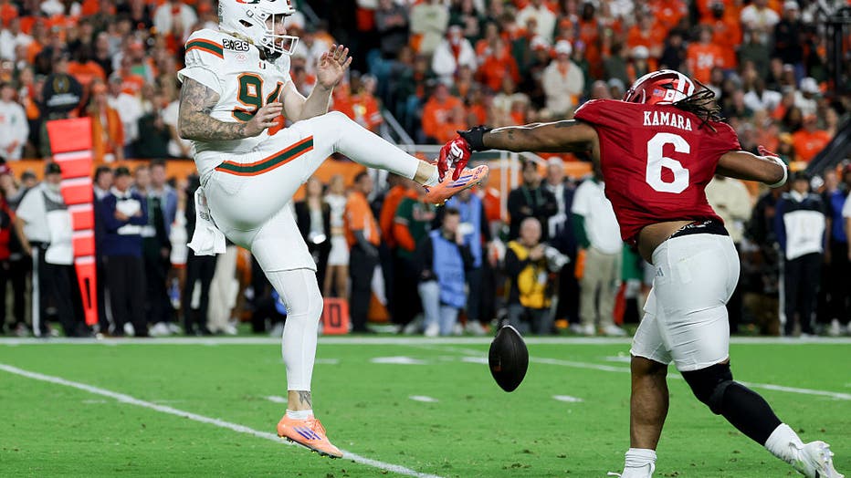 Mikail Kamara of the Indiana Hoosiers blocks a punt from Dylan Joyce of the Miami Hurricanes in the College Football Playoff National Championship. (Photo by CFP/Getty Images)
