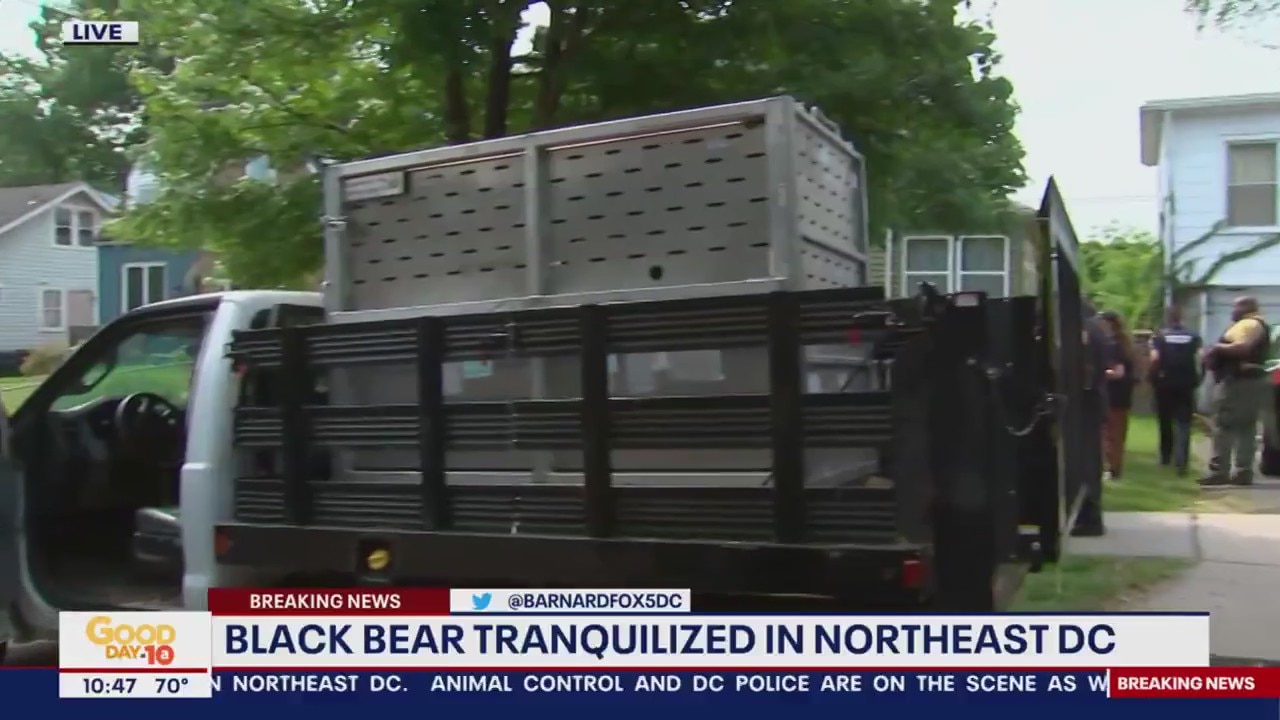 Authorities say a black bear was tranquilized and safely captured after its presence drew crowds Friday morning in a northeast D.C. neighborhood.