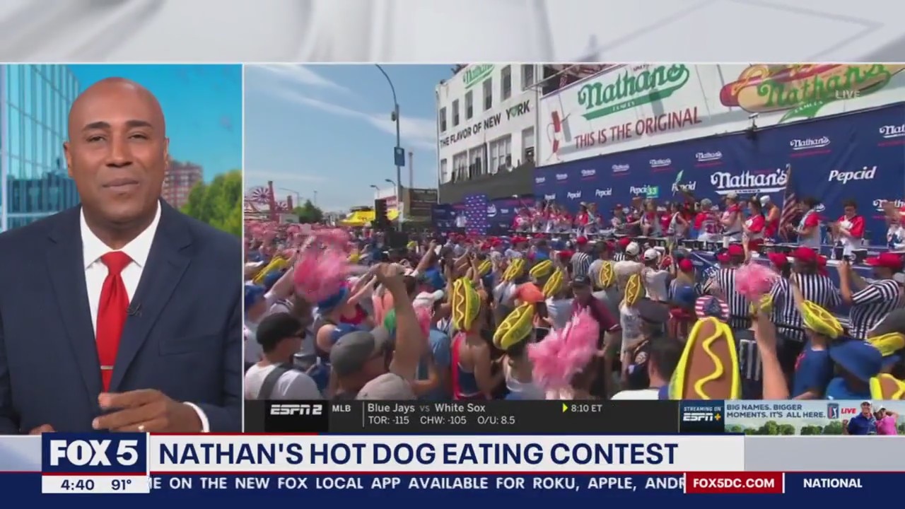 Nathan?s Famous Hot Dog Eating Contest was delayed for nearly 2-hours due to weather. Joey Chestnut ate 62 hot dogs in ten minutes to clinch the title again.