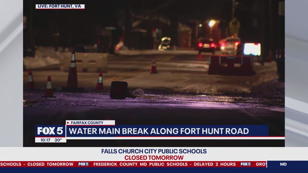 A water main break along Fort Hunt Road in Fairfax County has shut down streets as crews work to repair it.