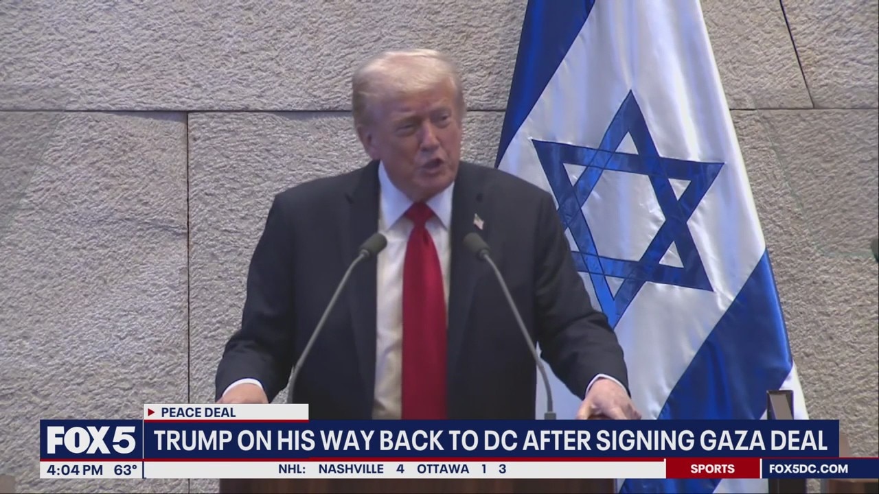 President Donald Trump on his way back to DC after signing a Gaza deal