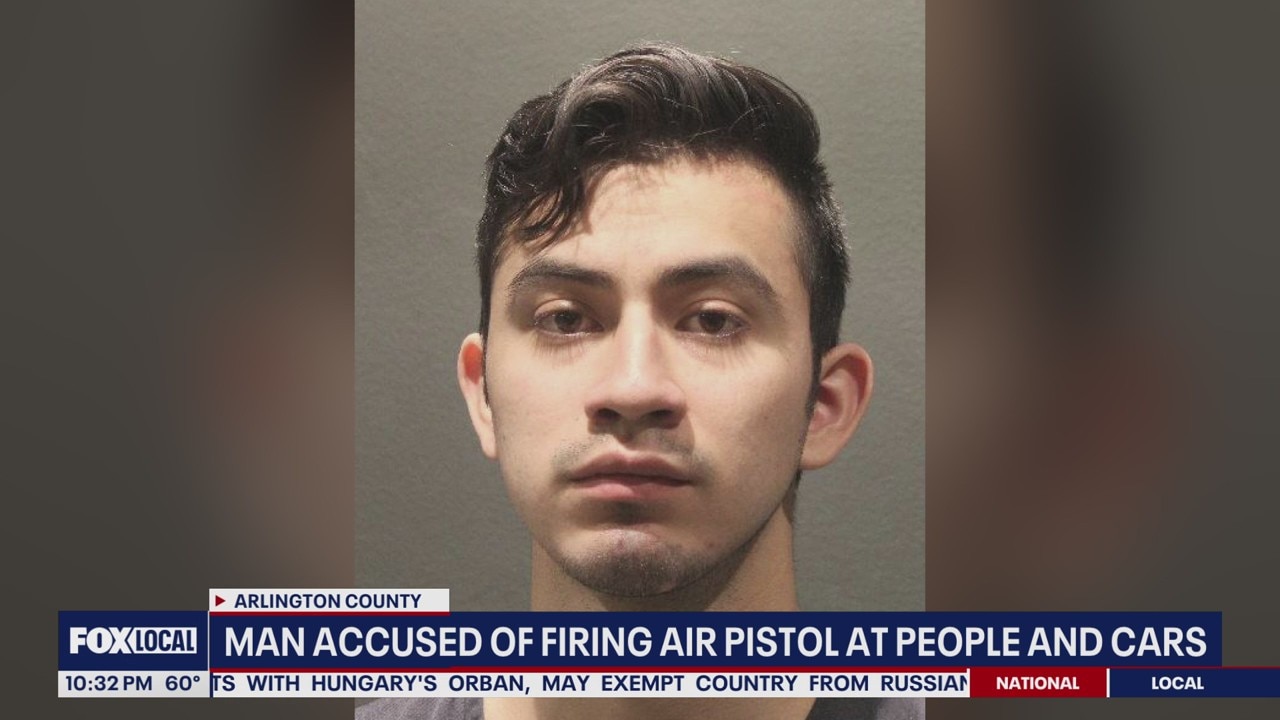 Arlington County police have arrested a man accused of injuring at least two people and damaging three cars by shooting an air pistol out of his apartment building.