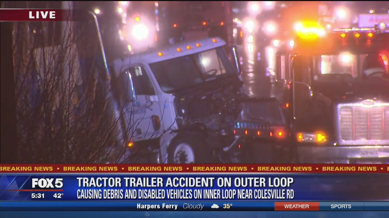 Several vehicles were damaged and portions of the D.C. beltway were closed after a tractor trailer struck a jersey wall and jack-knifed across the lanes of the outer loop Wednesday morning.