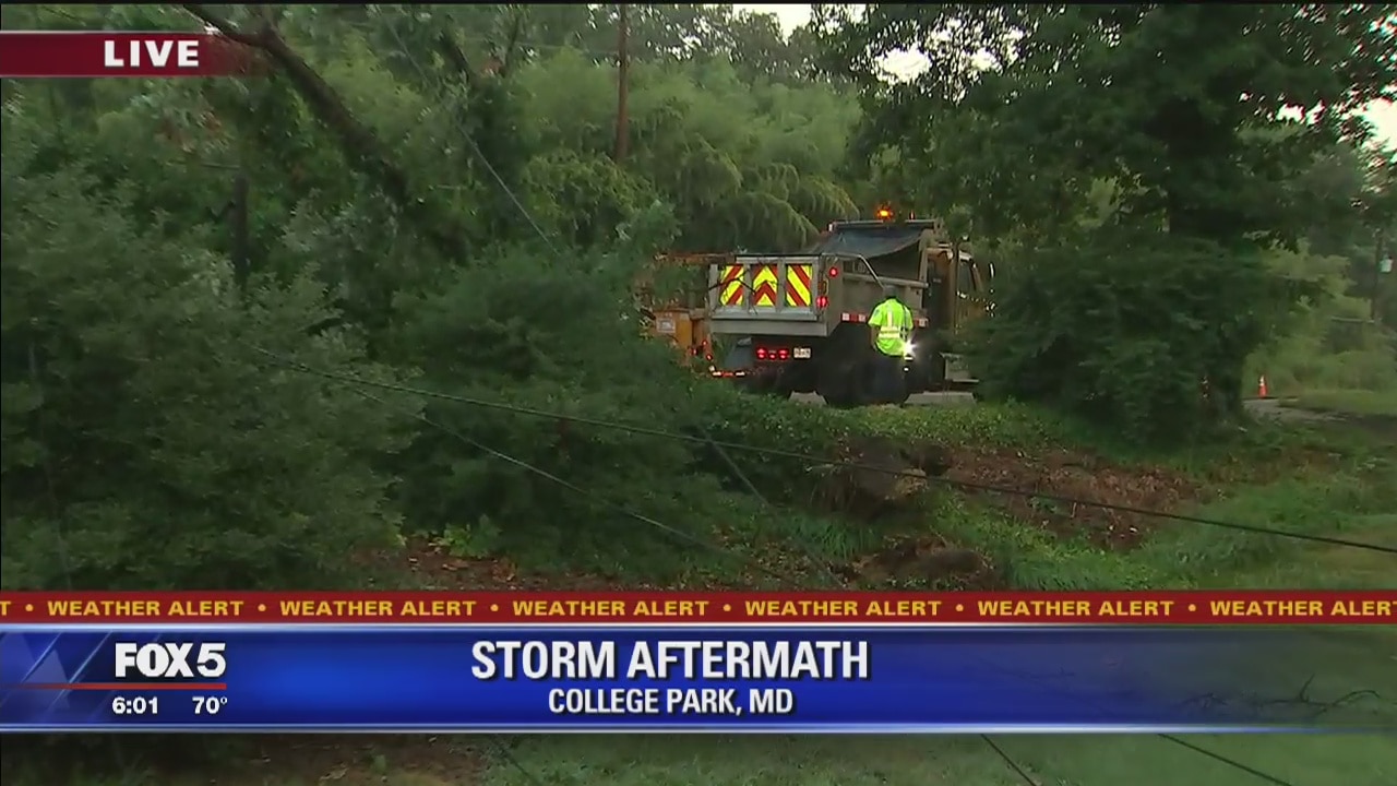 Heavy storms moved through the D.C. region Tuesday night leaving behind downed trees, downed wires and flooded roadways.