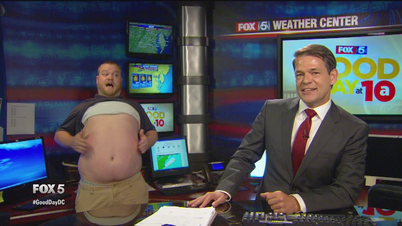 Issac the Belly Rally guy did his best to help Washington Nationals win at teh game the other night - but can Tucker Barnes work through the same distraction during his weather forecast?