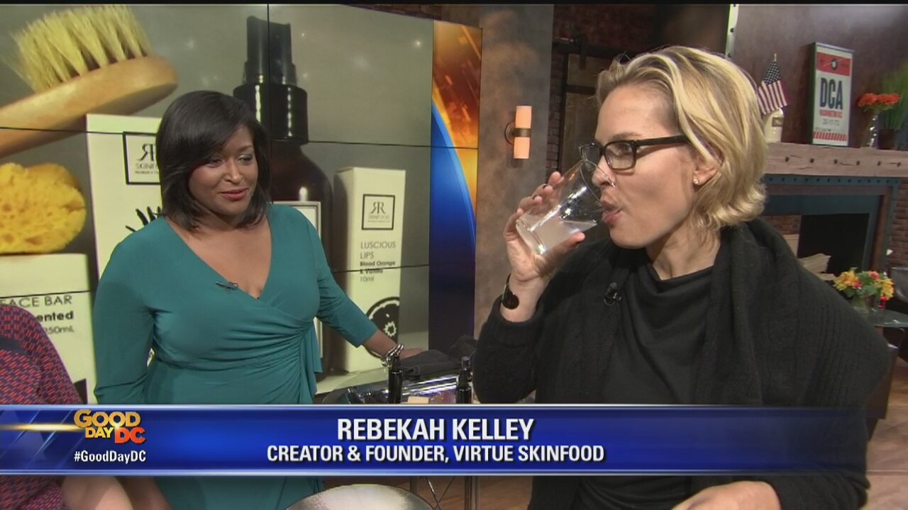 Rebekah Kelley, creator and founder of VIRTUE SKINFOOD eats her skin car product on FOX 5 to demonstrate just how natural the product really is.