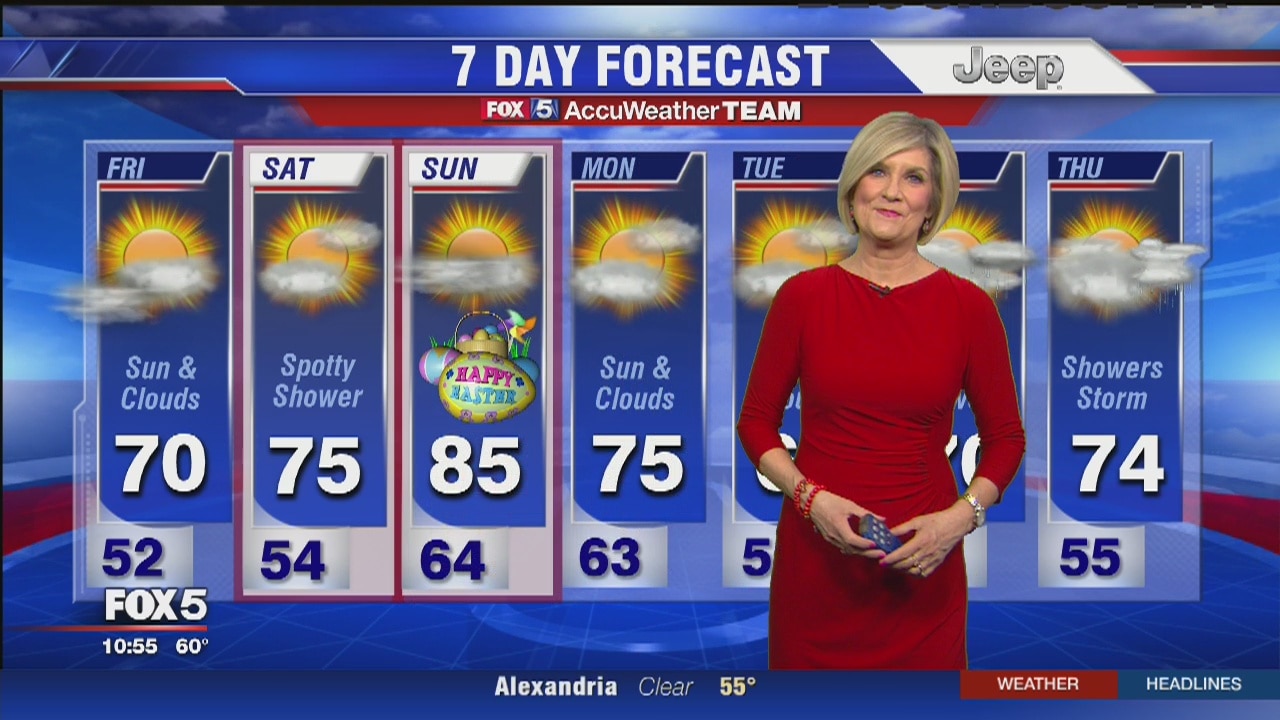FOX 5's Sue Palka has the latest on Friday's weather forecast and a look ahead to Easter weekend.