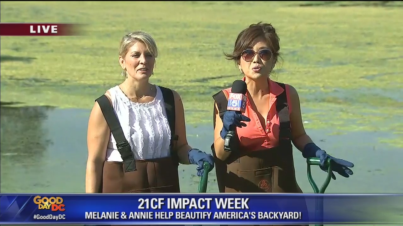 FOX 5?s Annie Yu and Melanie Alnwick work with National Park Service spokesman Mike Litterst to clean up the pond at Constitution Gardens for Impact Week 2017!