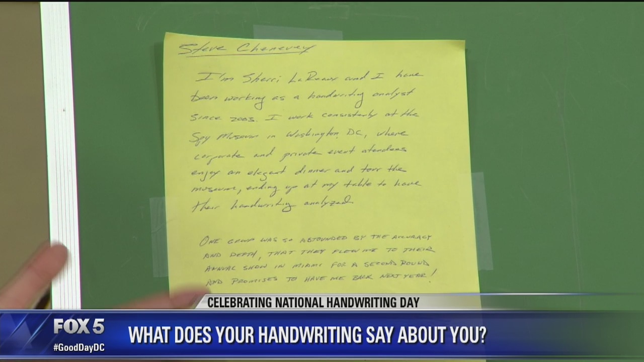 Are you introverted, extroverted, logical, emotional, reserved? The answer may be in your handwriting! Handwriting analyst, Sherri LaReaux, joined us on National Handwriting Day to examine the script of FOX 5?s Allison Seymour, Holly Morris, Wisdom Martin and Steve Chenevey!