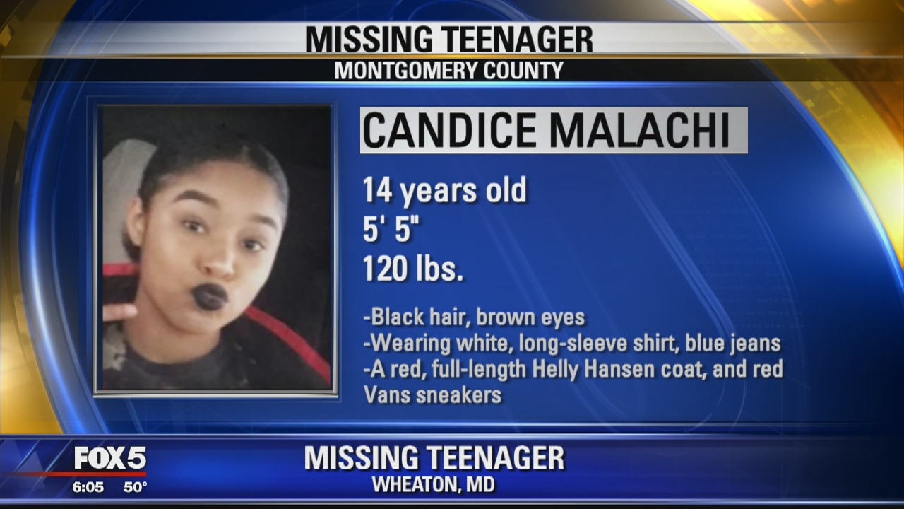 Montgomery County Police are searching for a teenager who was reported missing after not coming home from school Wednesday. 14-year-old Candice Armony Malachi, of Veirs Mill Road in Wheaton, did not return home after classes ended on Wednesday and has not contacted her family.