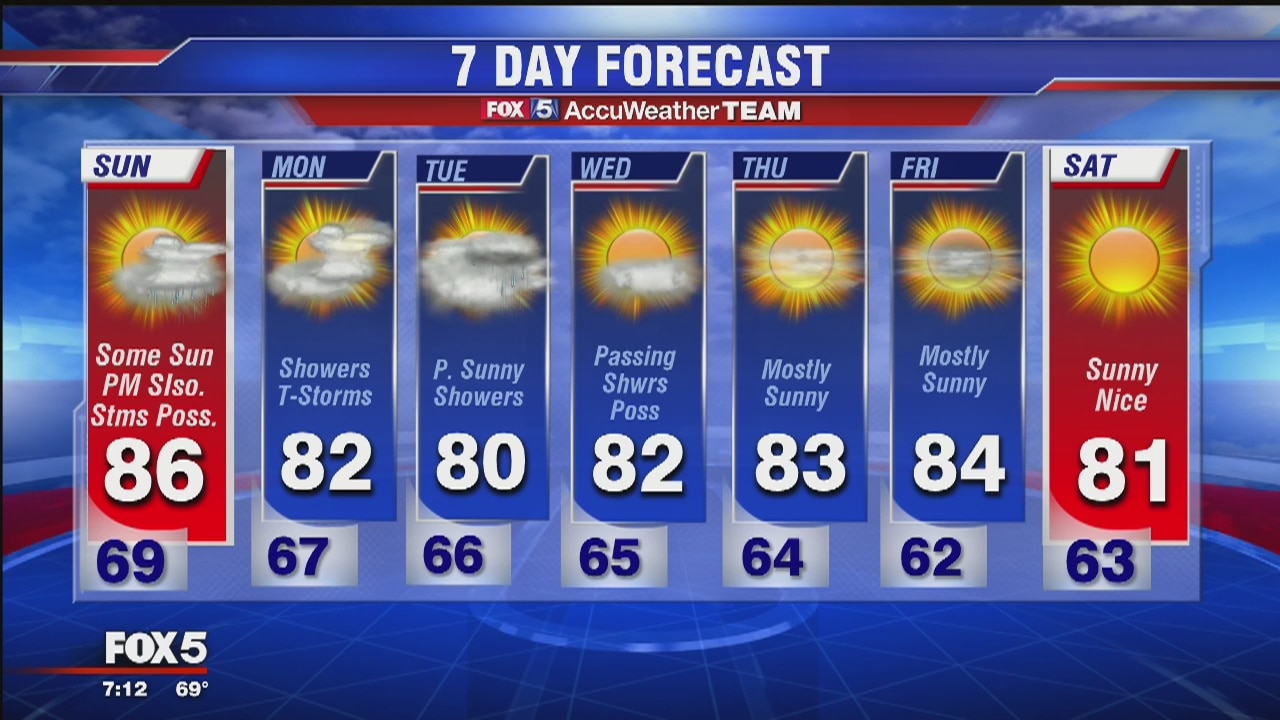 Rain and flooding are still prevalent throughout the area, but the area should be slowing heading into the week. Heading into Sunday showers tapering, with fog and humidity overnight.
