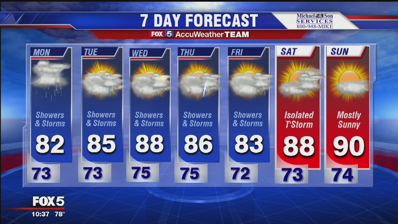 Tonight: Becoming cloudier and muggy. Temps in the low 70s. For Monday, scattered showers and storms. Temps in the lower 80s.