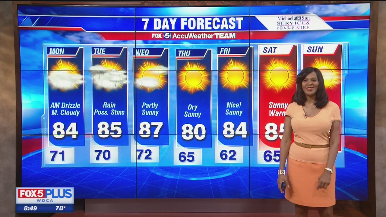 Storms overnight, and on Monday mostly cloudy. Temps stay in the 80s going into this week, but sunshine ahead for the end of this week.