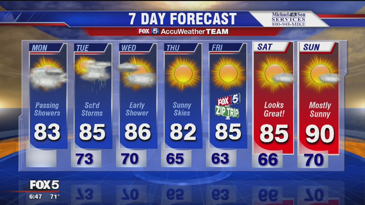 Partly sunny with temps in the upper 70s to lower 80s for Monday. Scattered storms and showers heading into the week. Plenty of sunshine will back for the weekend.