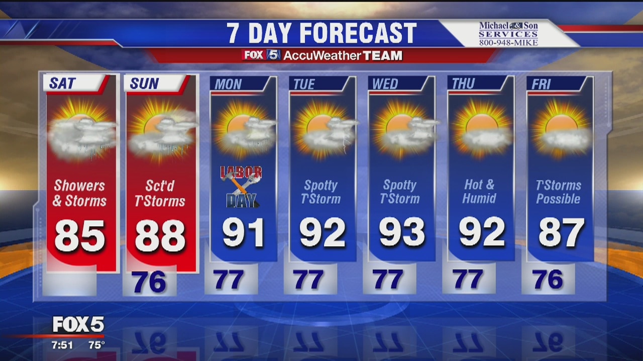 Saturday: showers and storms. Temps in the mid 80s. Sunday, drier and hotter, with temps in the 80s. For Labor Day Monday, we can expect a few thunderstorms, still warm and humid with temps in the lower 90s.