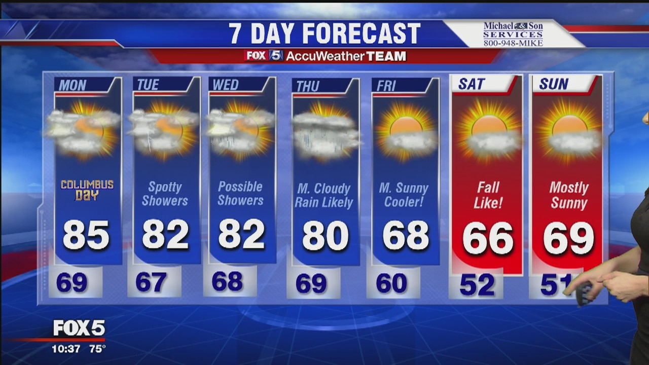 Overnight patchy fog, warm with above-average temperatures to begin the week. Isolate showers and storns through the week, becoming cooler and more fall-like by the end of the week.