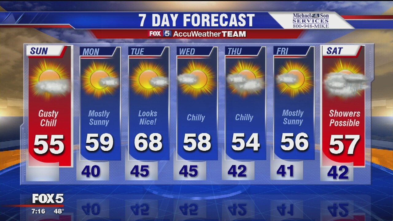 Lots of wind for football Sunday. Gusty and chilly during the day, becoming colder in the evening. But, plenty of sunshine ahead for the week. Mild temps in the mid to upper 50s for most of the week. Tuesday warmer with high of 68.