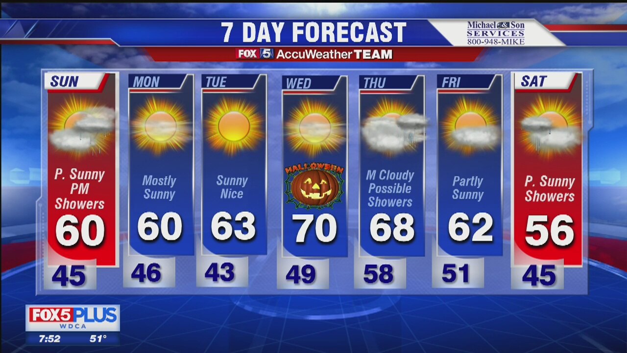 An overcast night Saturday. Dry and cool for the Marine Corps Marathon with temps on the rise. Weather will be nice and mild for Halloween with temps in the low 70s.