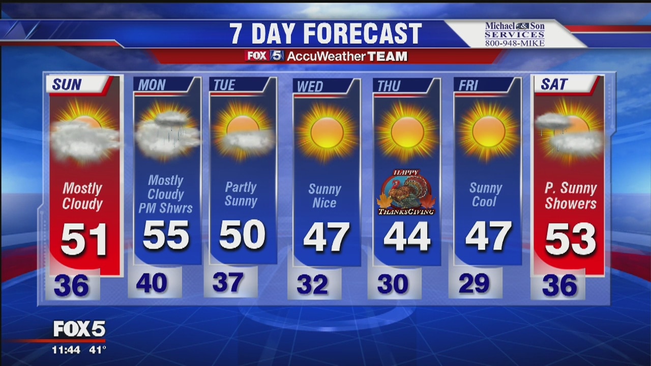 Cold Saturday night with increasing clouds. Sunday mostly cloudy, and temps will stay on the cooler side with temps in the low 50s. We may see some showers as well heading into the week, but will clear up for Thanksgiving.