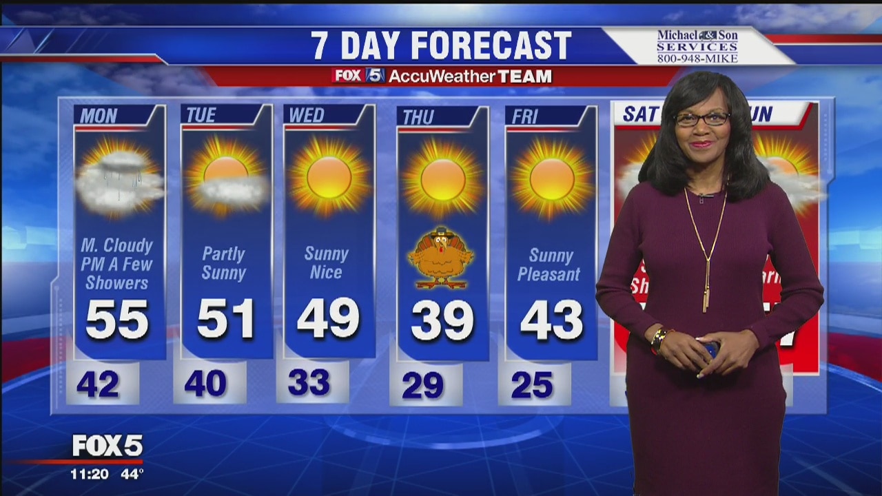 Mostly cloudy Sunday night. Some scattered showers Monday evening. Temps will stay on the lower side into the week. Thanksgiving will be clear by cold -- temps in the upper 30s, lower 40s.