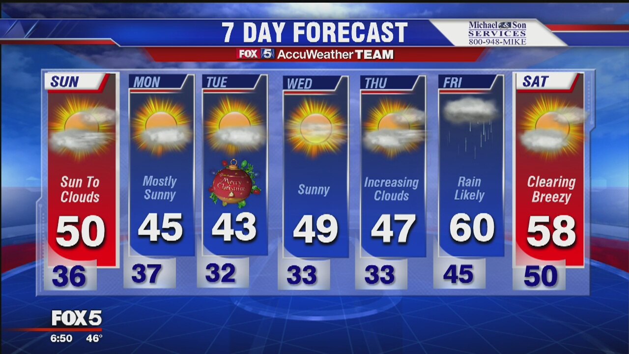 Quiet travel weather for Sunday. A few showers for Sunday night. Seasonably chilly heading into Christmas. Most of next week should be dry.