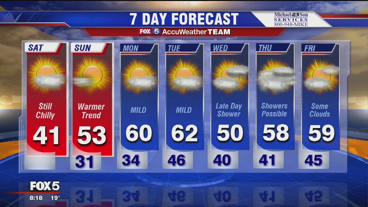 Cold temps but mild Saturday. Warming up Sunday with temps in the lower 50s. Showers possible as we head into week. Temps in the low 60s Monday and Tuesday.