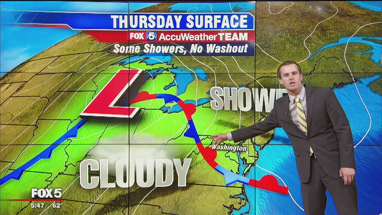 It won?t be a washout -- but keep the umbrella handy as scattered showers are expected Thursday afternoon and into the evening hours. FOX 5?s Mike Thomas says we can expect mild temperatures with highs in the upper 70s and some sunshine before the unsettled weather moves in to the region.
