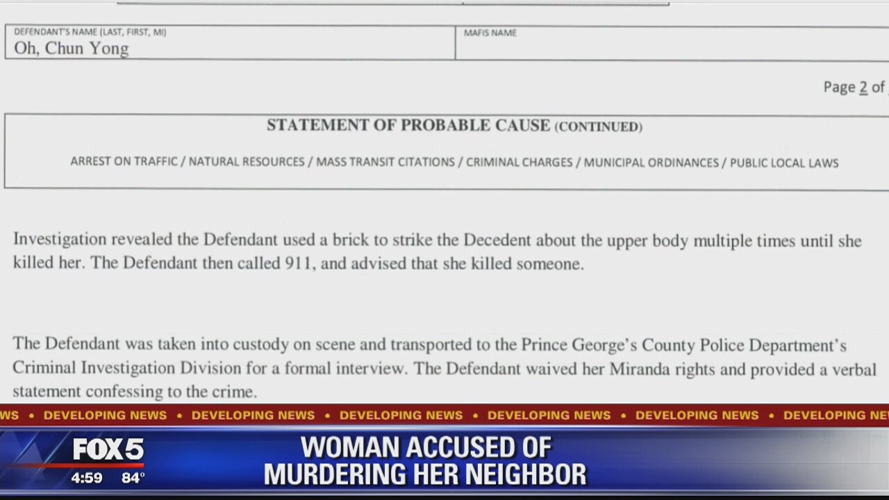 A 73-year-old Bladensburg woman is jailed without bond after she allegedly used a brick to murder her 82-year-old neighbor early Sunday morning.