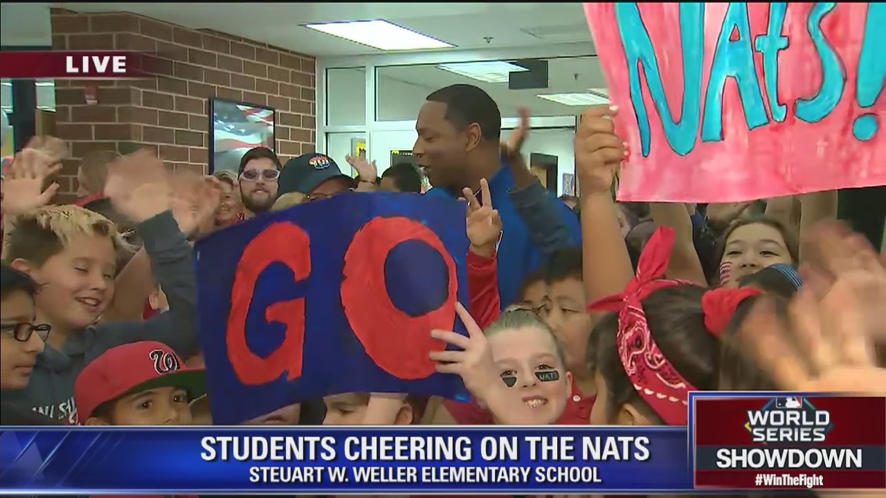 Students cheer on the Nationals at Steuart W. Weller Elementary School