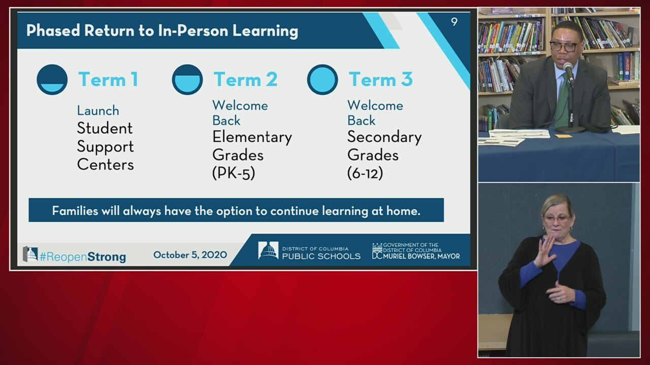 D.C. Public Schools Chancellor Lewis D. Ferebee announced a phased reopening plan offering limited in-person instruction to some students by the start of the second term on November 9.