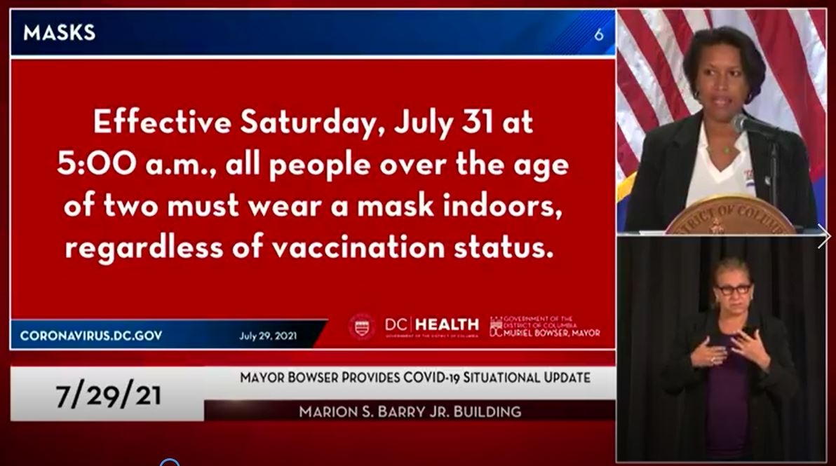 D.C. Mayor Muriel Bowser on Thursday restored masked mandates - regardless of vaccination status.