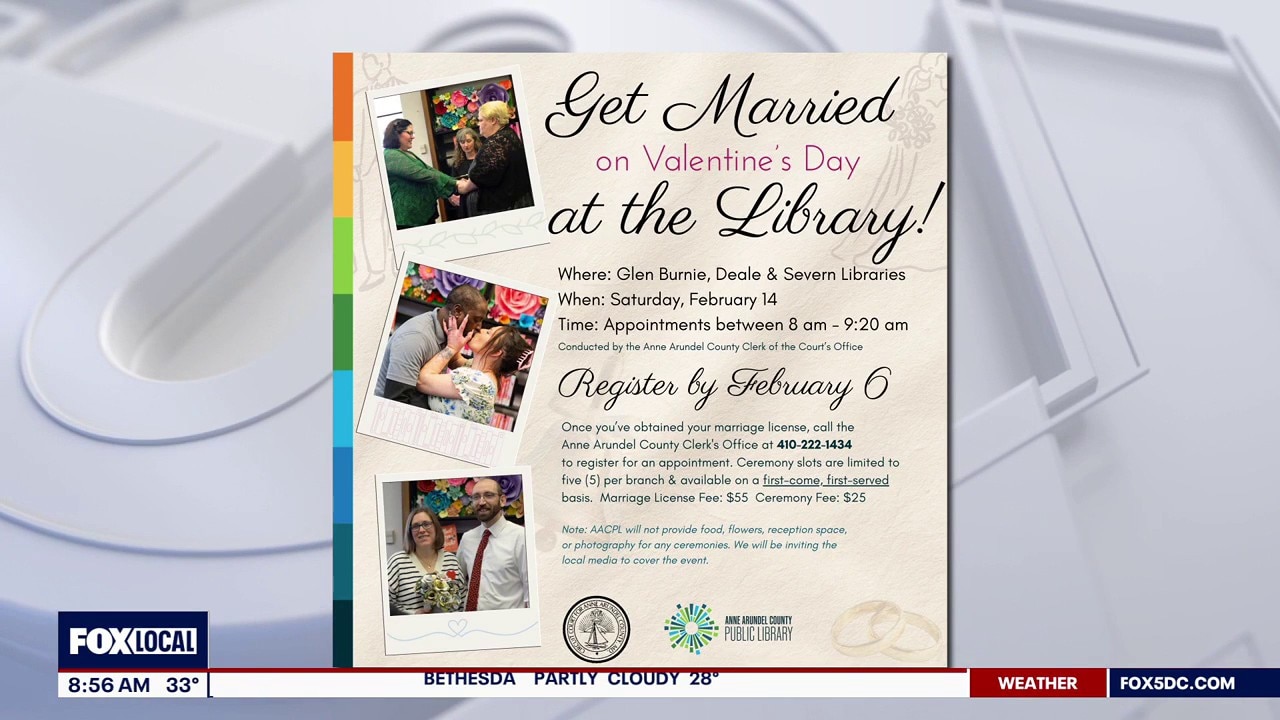 This year, three Anne Arundel County Public Library (AACPL) locations served as wedding venues for the Anne Arundel County Clerk’s Office on Valentine’s Day. Up to five ceremonies took place at each of the participating branches – Deale, Glen Burnie and Severn Libraries. The Anne Arundel County Clerk of the Court’s Office conducted the ceremonies, and allowed library-loving couples to invite up to 18 guests.